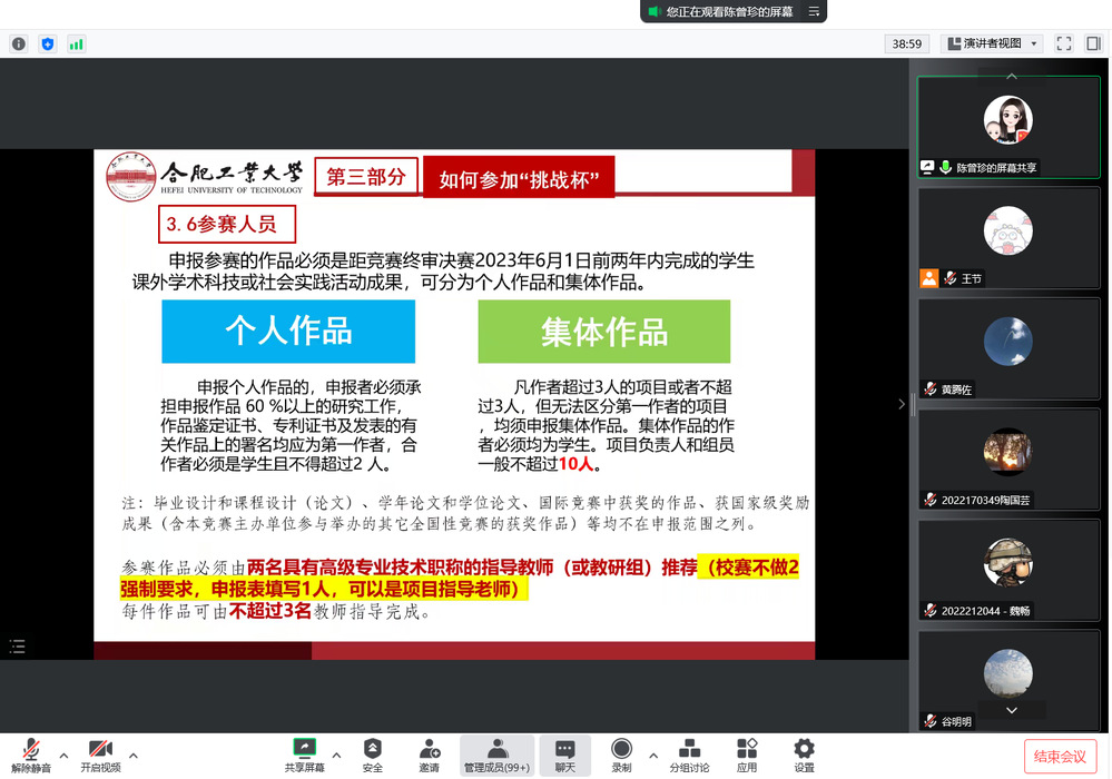 科技创新中心承办的2023年第十八届“挑战杯”全国大学生课外学术科技作品竞赛立项申报宣讲培训会在腾讯会议和B站同步举行。宣讲培训会邀请校团委创新发展部部长陈曾珍老师分享参赛注意事项和参赛经验。亚洲色吧