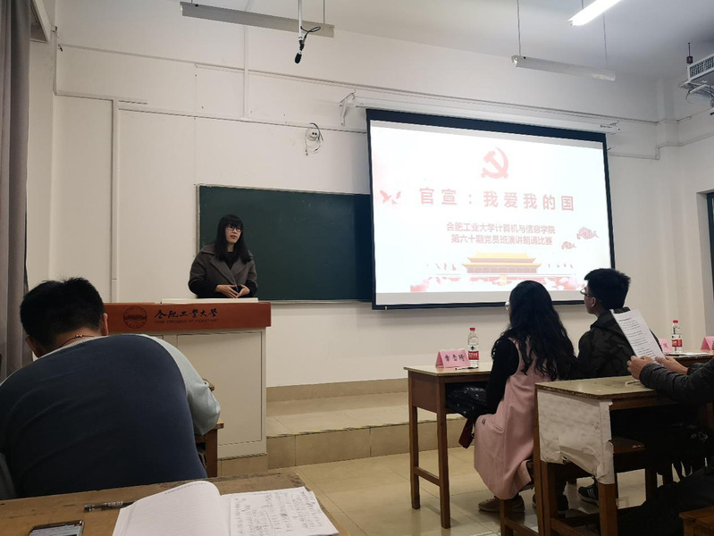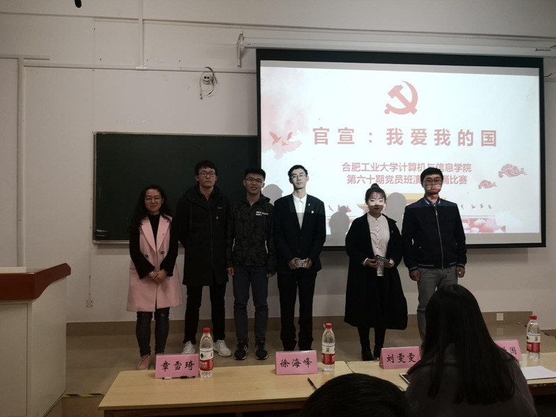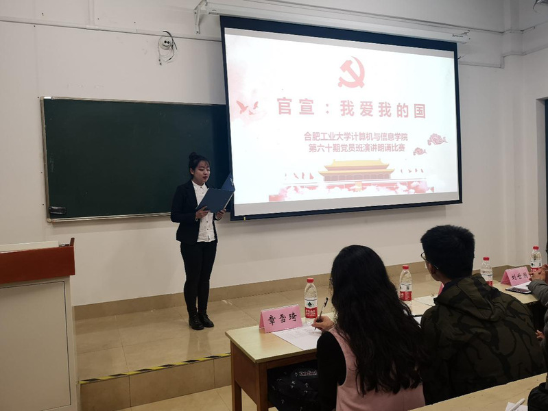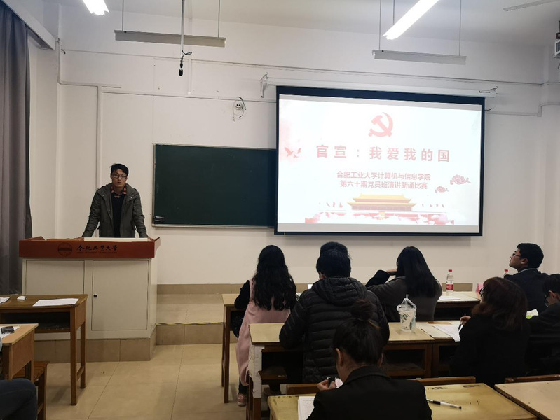 第60期党员班于2018年11月11日晚七点在翡翠湖校区3教309举办主题为“官宣,我爱我的国”朗诵演讲比赛。亚洲色吧相关负责老师以及各专业党支部副书记等出席并担任评委,党员班55位成员参加本次活动。