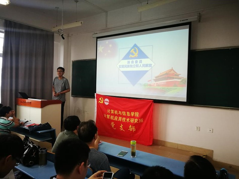 首先,2017级计算机专业1班党员汤钰炜同学用PPT的形式,带领与会老师、同学一起回顾了中国共产党建党、建国的光辉历史;