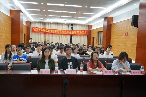 在风采展示环节中,四位国家奖学金获得者在学习方法、竞赛级创新创业项目、大学业余生活分配、个人获奖心得等方面进行了展示分享。其中信安14-1班的阴漫江建议利用各种渠道了解学科、行业的前沿动态;电信工14-2班的周生龙重点讲述了竞赛经历以及动手实践能力的重要性;信安15-1班的黄梦洁强调了要充分利用课堂时间;计科15-3班的王雯云则建议有能力的同学可以尽早进实验室接触项目。随后答疑环节,学长学姐们就所提的 “有哪些获取前沿信息的渠道”、“如何缓解学习压力”、“如何安排奖学金”等问题做了详细的解答,同学们有序提问,虚心学习,现场气氛活跃。2017级辅导员黄凤老师对各类奖、助学金的基本概况进行讲解,同时对同学们进行了鼓励教育并提出了殷切的期望。